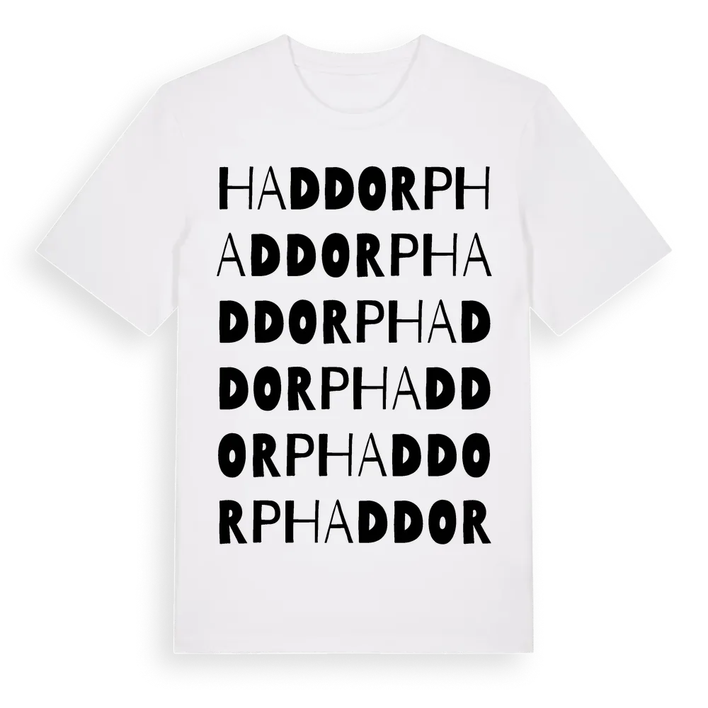 Haddorp ordlek t-shirt är inspirerad av byn Haddorp i Östergötlands län, Sverige. Tröjan är designad för dig som har en speciell koppling till platsen – oavsett om du bor här, har rötterna här eller bara älskar Haddorp.