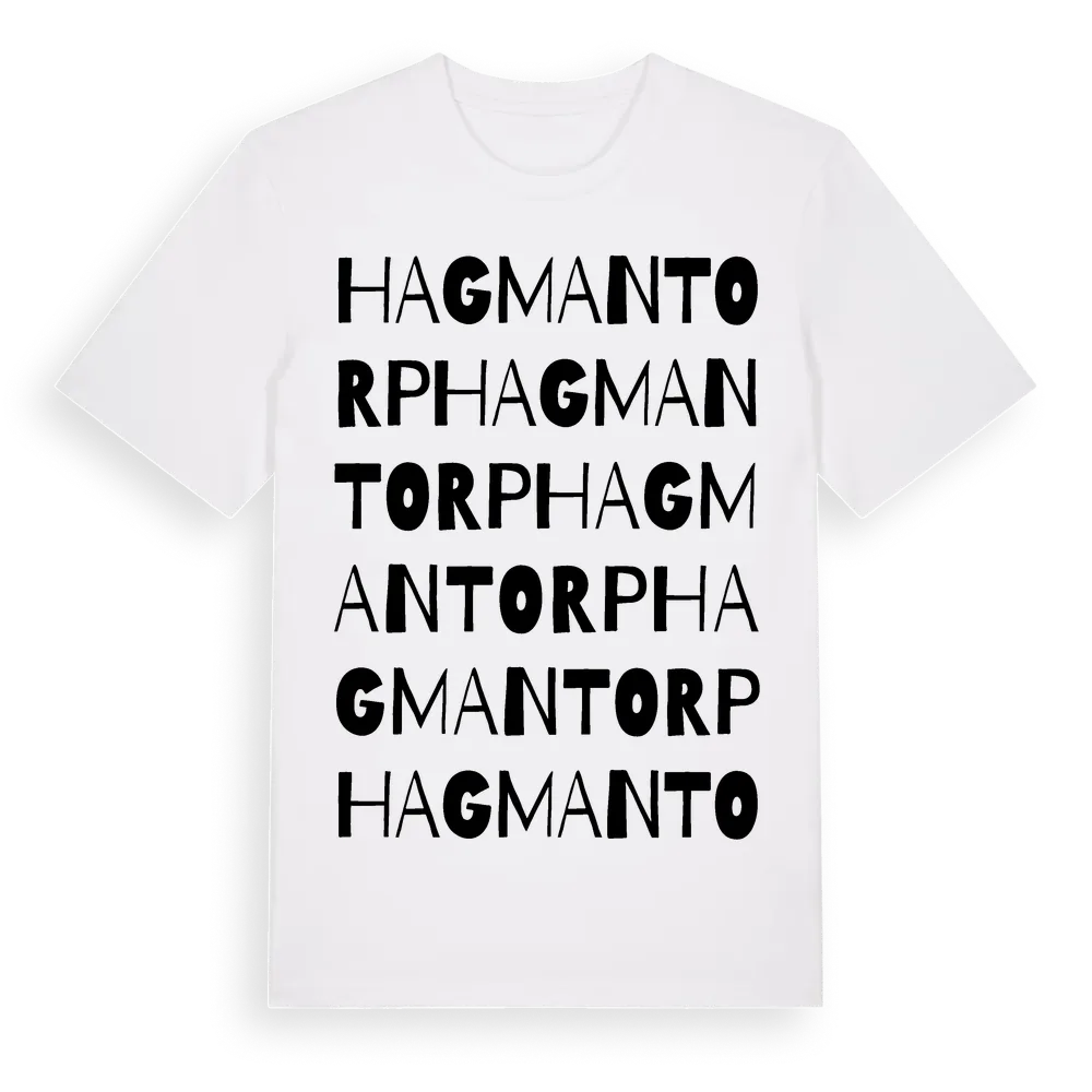 Hagmantorp ordlek t-shirt är inspirerad av Hagmantorp i Östergötlands län, Sverige. Tröjan är designad för dig som har en speciell koppling till platsen – oavsett om du bor här, har rötterna här eller bara älskar Hagmantorp.