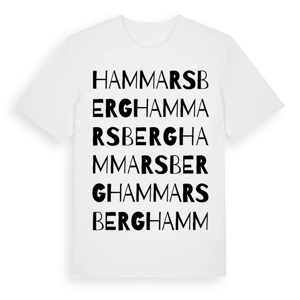 Hammarsberg ordlek t-shirt är inspirerad av Hammarsberg i Östergötlands län, Sverige. Tröjan är designad för dig som har en speciell koppling till platsen – oavsett om du bor här, har rötterna här eller bara älskar Hammarsberg.