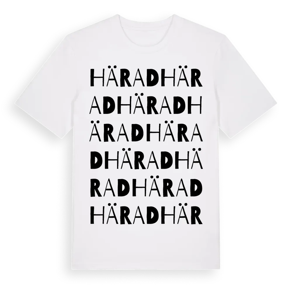 Härad ordlek t-shirt är inspirerad av byn Härad i Östergötlands län, Sverige. Tröjan är designad för dig som har en speciell koppling till platsen – oavsett om du bor här, har rötterna här eller bara älskar Härad.