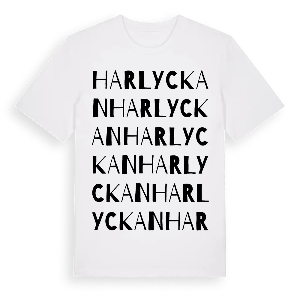 En ordlek byggd på Harlyckans namn. Subtilt och klurig – ett motiv som bara de som verkligen känner platsen fullt ut förstår. Premium bomull, unisex – från Harlyckan i Östergötlands län.