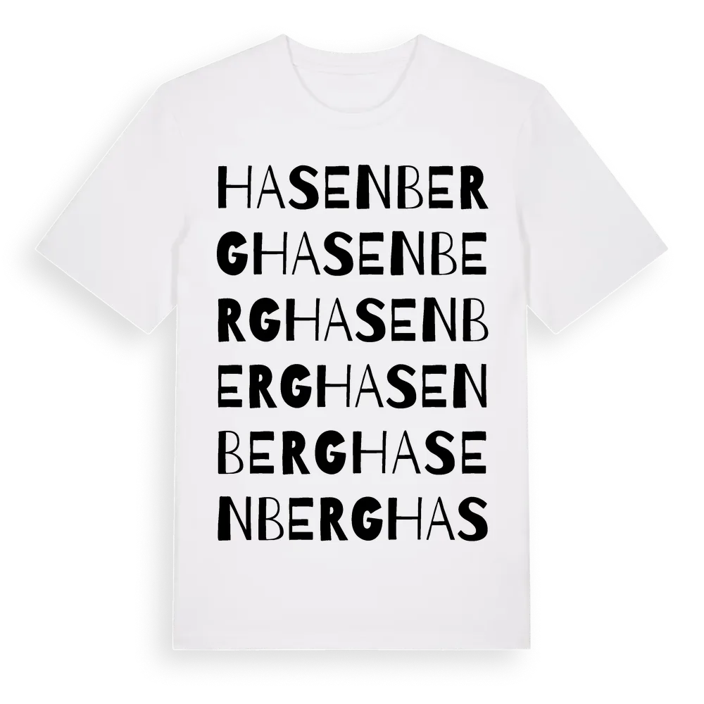 Hasenberg ordlek t-shirt är inspirerad av Hasenberg i Östergötlands län, Sverige. Tröjan är designad för dig som har en speciell koppling till platsen – oavsett om du bor här, har rötterna här eller bara älskar Hasenberg.