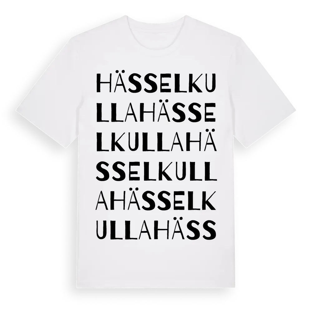 En ordlek byggd på Hässelkullas namn. Subtilt och klurig – ett motiv som bara de som verkligen känner platsen fullt ut förstår. Premium bomull, unisex – från Hässelkulla i Östergötlands län.