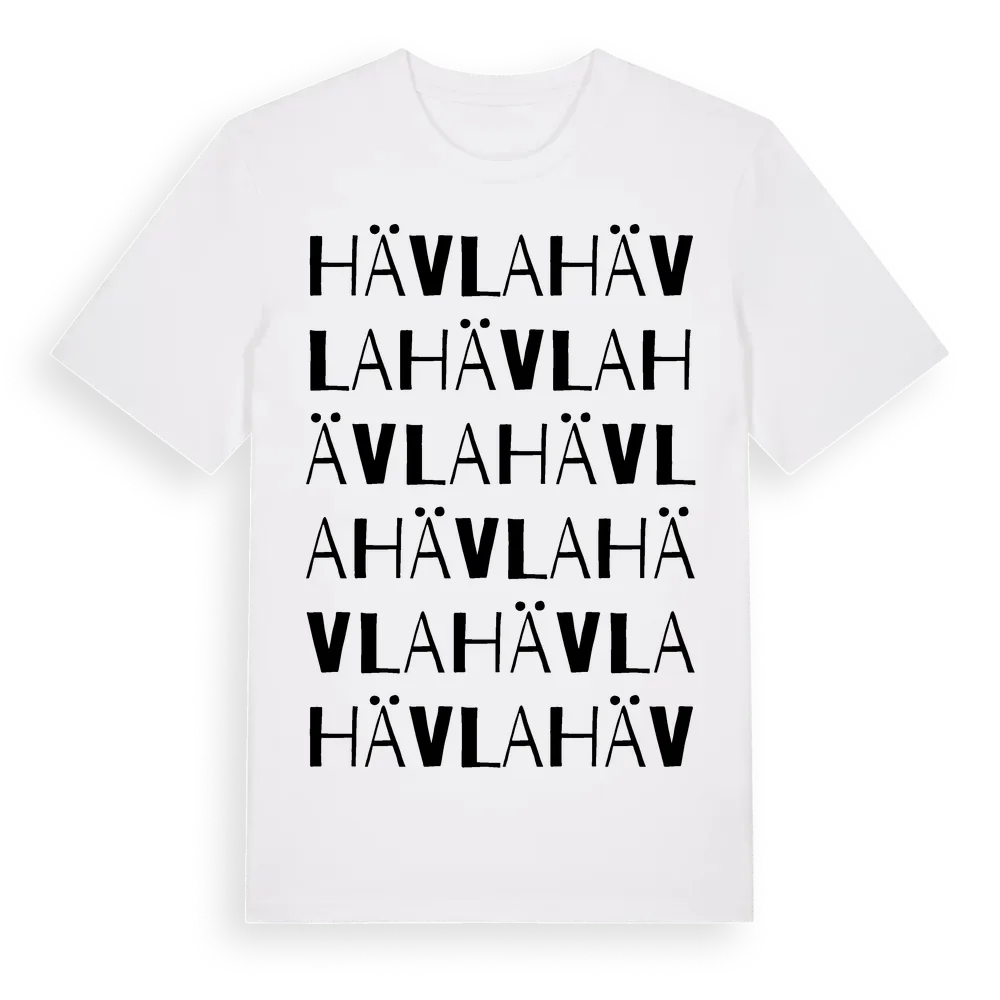 Hävla ordlek t-shirt är inspirerad av byn Hävla i Östergötlands län, Sverige. Tröjan är designad för dig som har en speciell koppling till platsen – oavsett om du bor här, har rötterna här eller bara älskar Hävla.