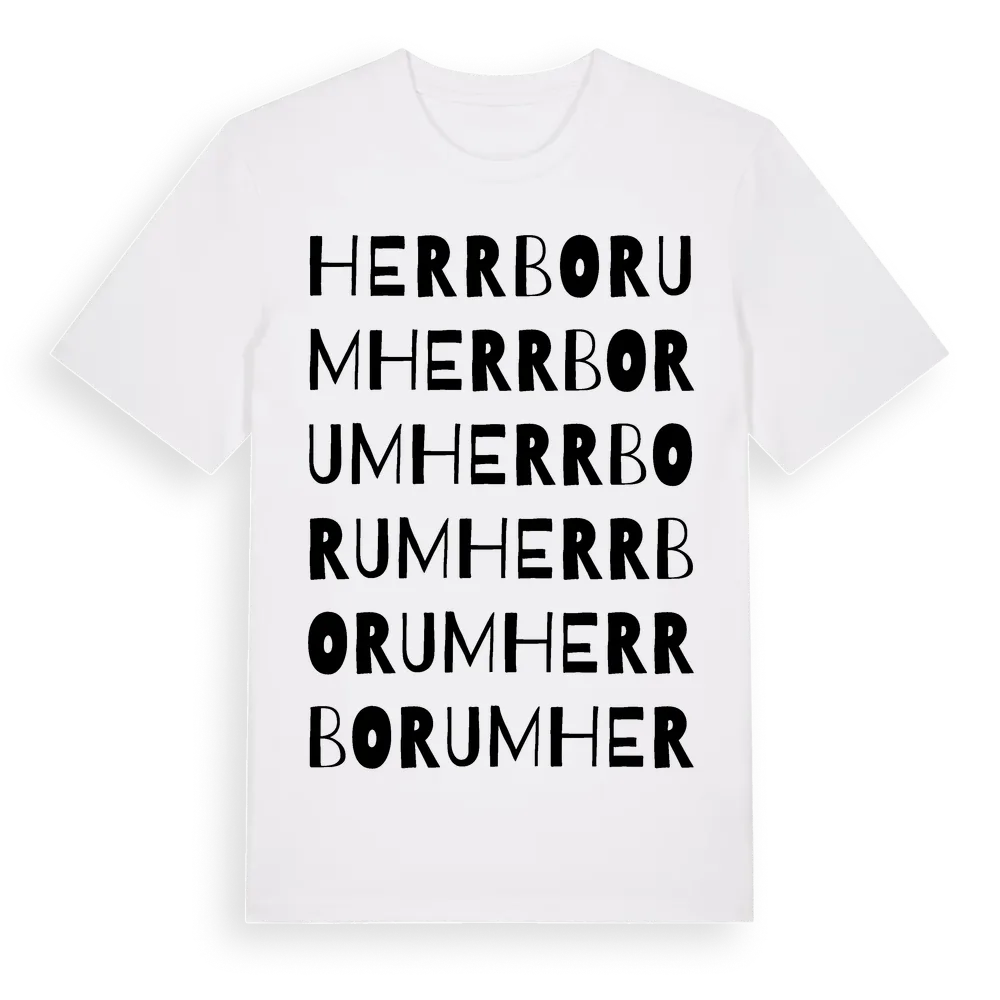 Herrborum ordlek t-shirt är inspirerad av Herrborum i Östergötlands län, Sverige. Tröjan är designad för dig som har en speciell koppling till platsen – oavsett om du bor här, har rötterna här eller bara älskar Herrborum.