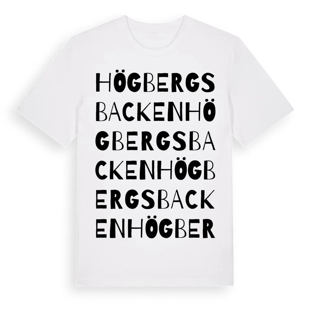 Högbergsbacken ordlek t-shirt är inspirerad av Högbergsbacken i Östergötlands län, Sverige. Tröjan är designad för dig som har en speciell koppling till platsen – oavsett om du bor här, har rötterna här eller bara älskar Högbergsbacken.