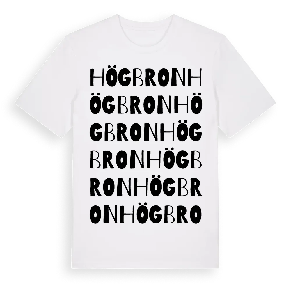 Högbron ordlek t-shirt är inspirerad av Högbron i Östergötlands län, Sverige. Tröjan är designad för dig som har en speciell koppling till platsen – oavsett om du bor här, har rötterna här eller bara älskar Högbron.