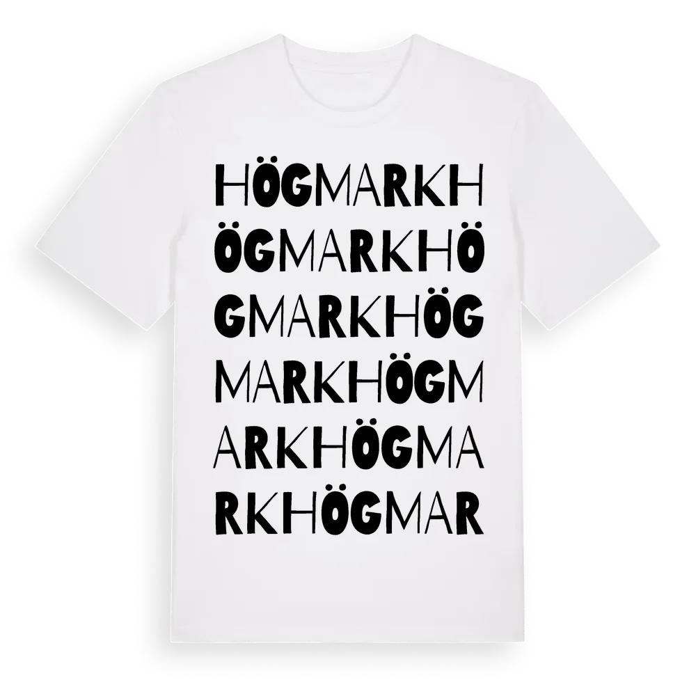 Högmark ordlek t-shirt är inspirerad av Högmark i Östergötlands län, Sverige. Tröjan är designad för dig som har en speciell koppling till platsen – oavsett om du bor här, har rötterna här eller bara älskar Högmark.
