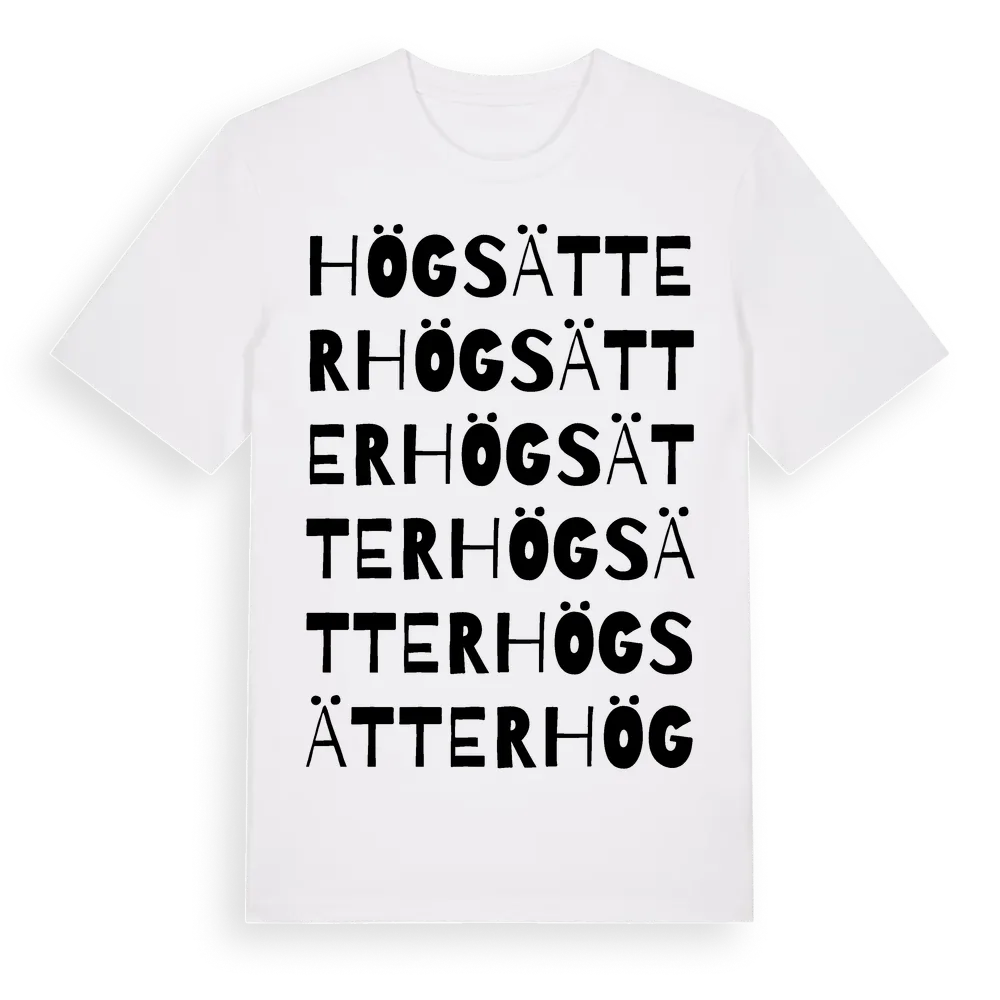 Högsätter ordlek t-shirt är inspirerad av Högsätter i Östergötlands län, Sverige. Tröjan är designad för dig som har en speciell koppling till platsen – oavsett om du bor här, har rötterna här eller bara älskar Högsätter.