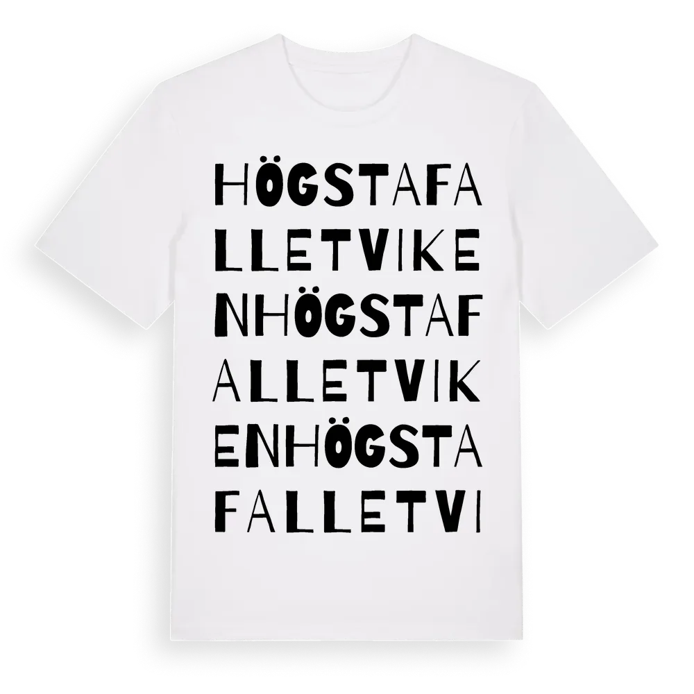 Högstafalletviken ordlek t-shirt är inspirerad av Högstafalletviken i Östergötlands län, Sverige. Tröjan är designad för dig som har en speciell koppling till platsen – oavsett om du bor här, har rötterna här eller bara älskar Högstafalletviken.