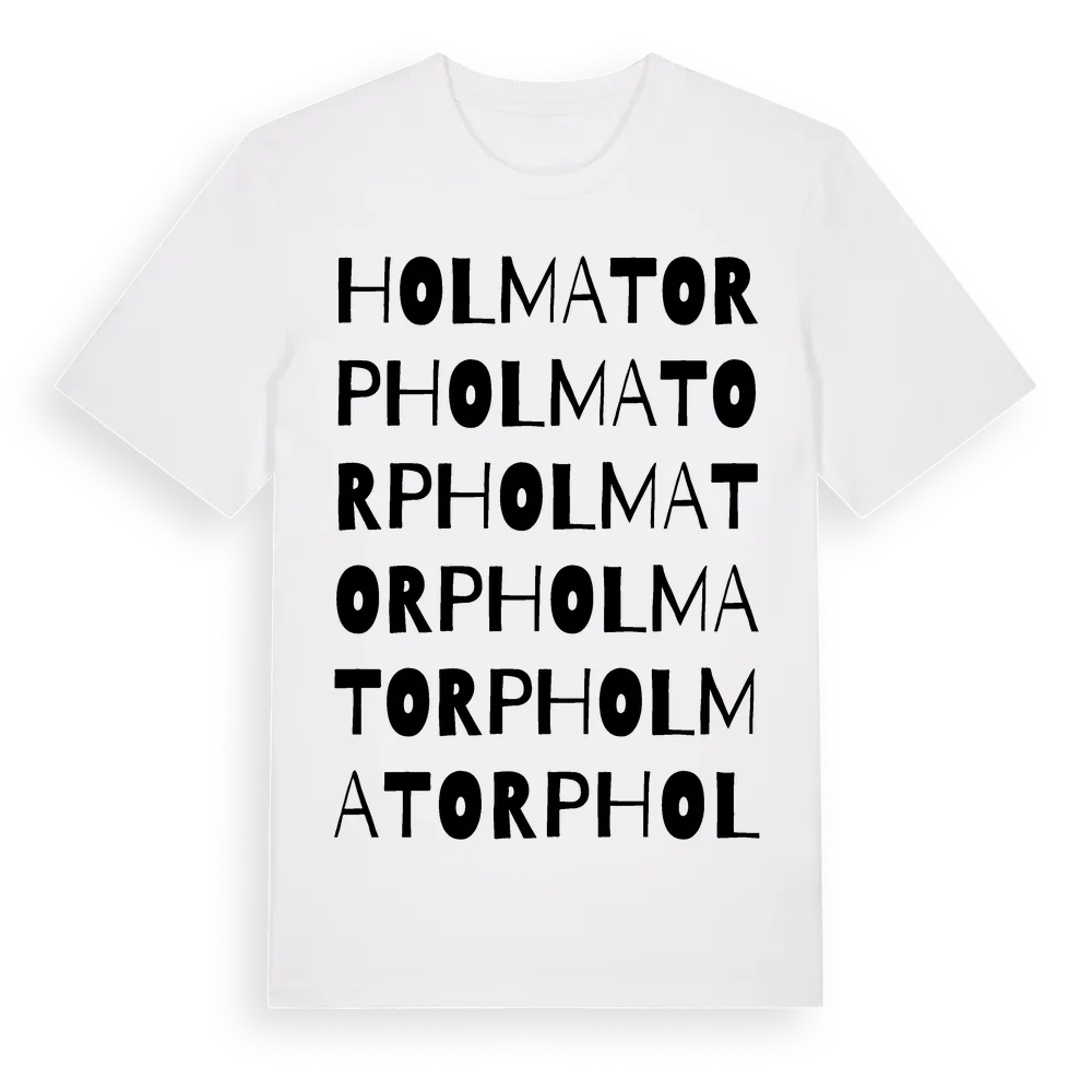 Holmatorp ordlek t-shirt är inspirerad av Holmatorp i Östergötlands län, Sverige. Tröjan är designad för dig som har en speciell koppling till platsen – oavsett om du bor här, har rötterna här eller bara älskar Holmatorp.
