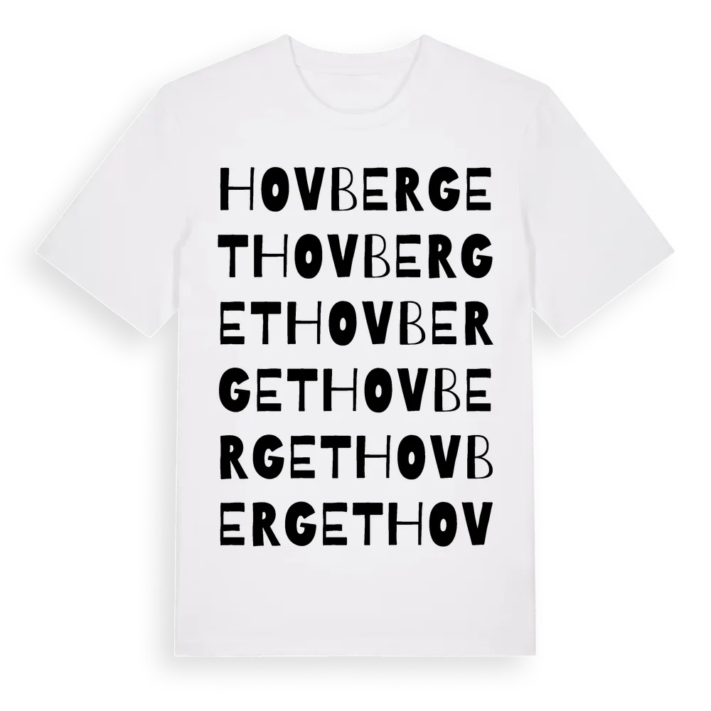 Hovberget ordlek t-shirt är inspirerad av byn Hovberget i Östergötlands län, Sverige. Tröjan är designad för dig som har en speciell koppling till platsen – oavsett om du bor här, har rötterna här eller bara älskar Hovberget.