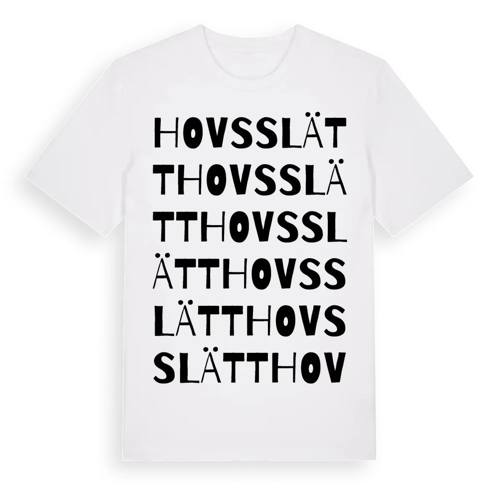 Hovsslätt ordlek t-shirt är inspirerad av Hovsslätt i Östergötlands län, Sverige. Tröjan är designad för dig som har en speciell koppling till platsen – oavsett om du bor här, har rötterna här eller bara älskar Hovsslätt.