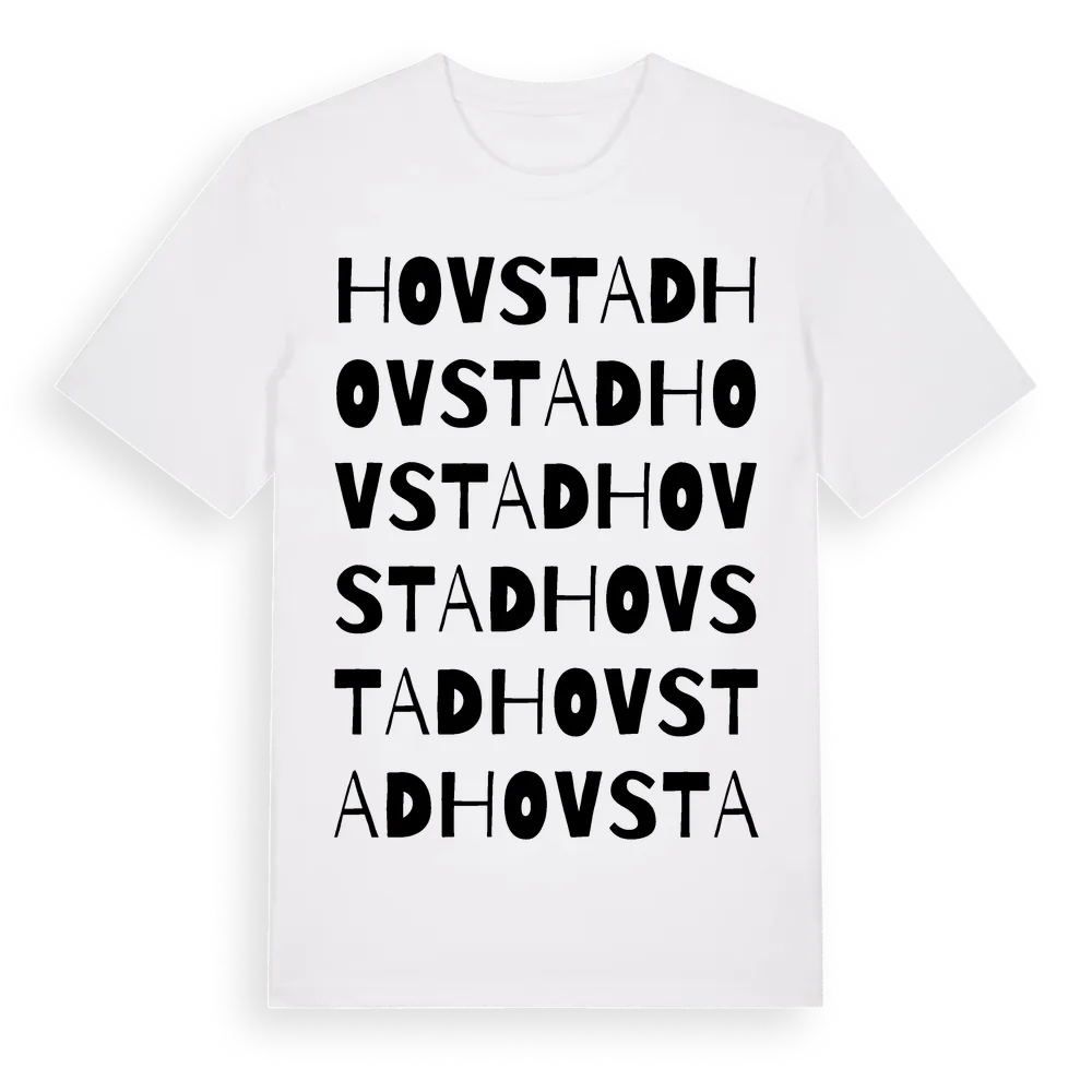 Hovstad ordlek t-shirt är inspirerad av byn Hovstad i Östergötlands län, Sverige. Tröjan är designad för dig som har en speciell koppling till platsen – oavsett om du bor här, har rötterna här eller bara älskar Hovstad.