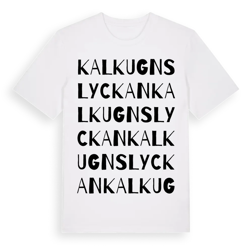Kalkugnslyckan ordlek t-shirt är inspirerad av Kalkugnslyckan i Östergötlands län, Sverige. Tröjan är designad för dig som har en speciell koppling till platsen – oavsett om du bor här, har rötterna här eller bara älskar Kalkugnslyckan.