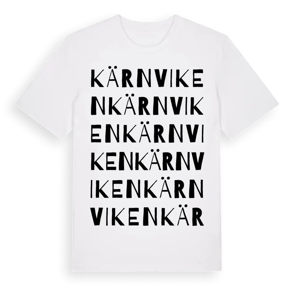 Kärnviken ordlek t-shirt är inspirerad av Kärnviken i Östergötlands län, Sverige. Tröjan är designad för dig som har en speciell koppling till platsen – oavsett om du bor här, har rötterna här eller bara älskar Kärnviken.