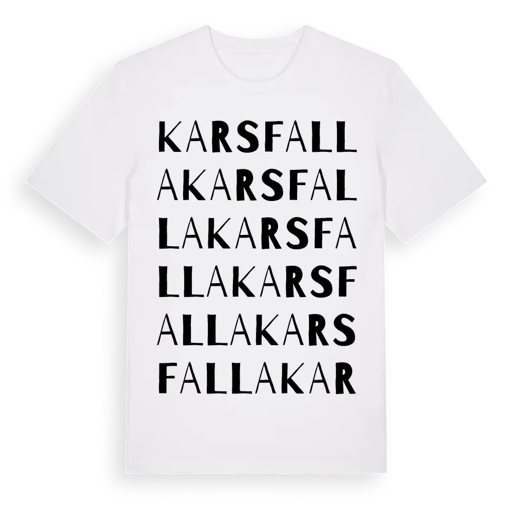 Karsfalla ordlek t-shirt är inspirerad av byn Karsfalla i Östergötlands län, Sverige. Tröjan är designad för dig som har en speciell koppling till platsen – oavsett om du bor här, har rötterna här eller bara älskar Karsfalla.