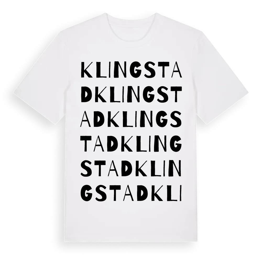 Klingstad ordlek t-shirt är inspirerad av byn Klingstad i Östergötlands län, Sverige. Tröjan är designad för dig som har en speciell koppling till platsen – oavsett om du bor här, har rötterna här eller bara älskar Klingstad.