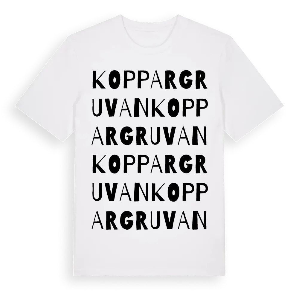 Koppargruvan ordlek t-shirt är inspirerad av Koppargruvan i Östergötlands län, Sverige. Tröjan är designad för dig som har en speciell koppling till platsen – oavsett om du bor här, har rötterna här eller bara älskar Koppargruvan.