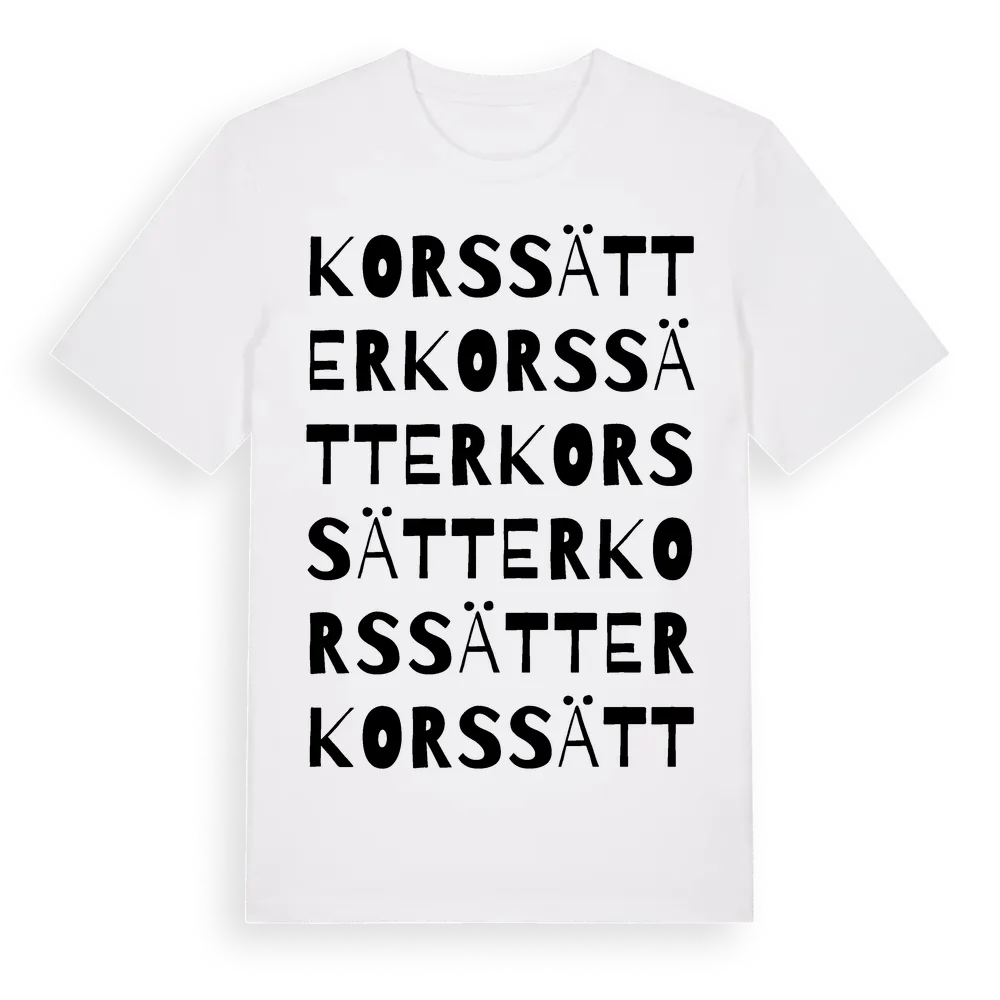 Korssätter ordlek t-shirt är inspirerad av Korssätter i Östergötlands län, Sverige. Tröjan är designad för dig som har en speciell koppling till platsen – oavsett om du bor här, har rötterna här eller bara älskar Korssätter.