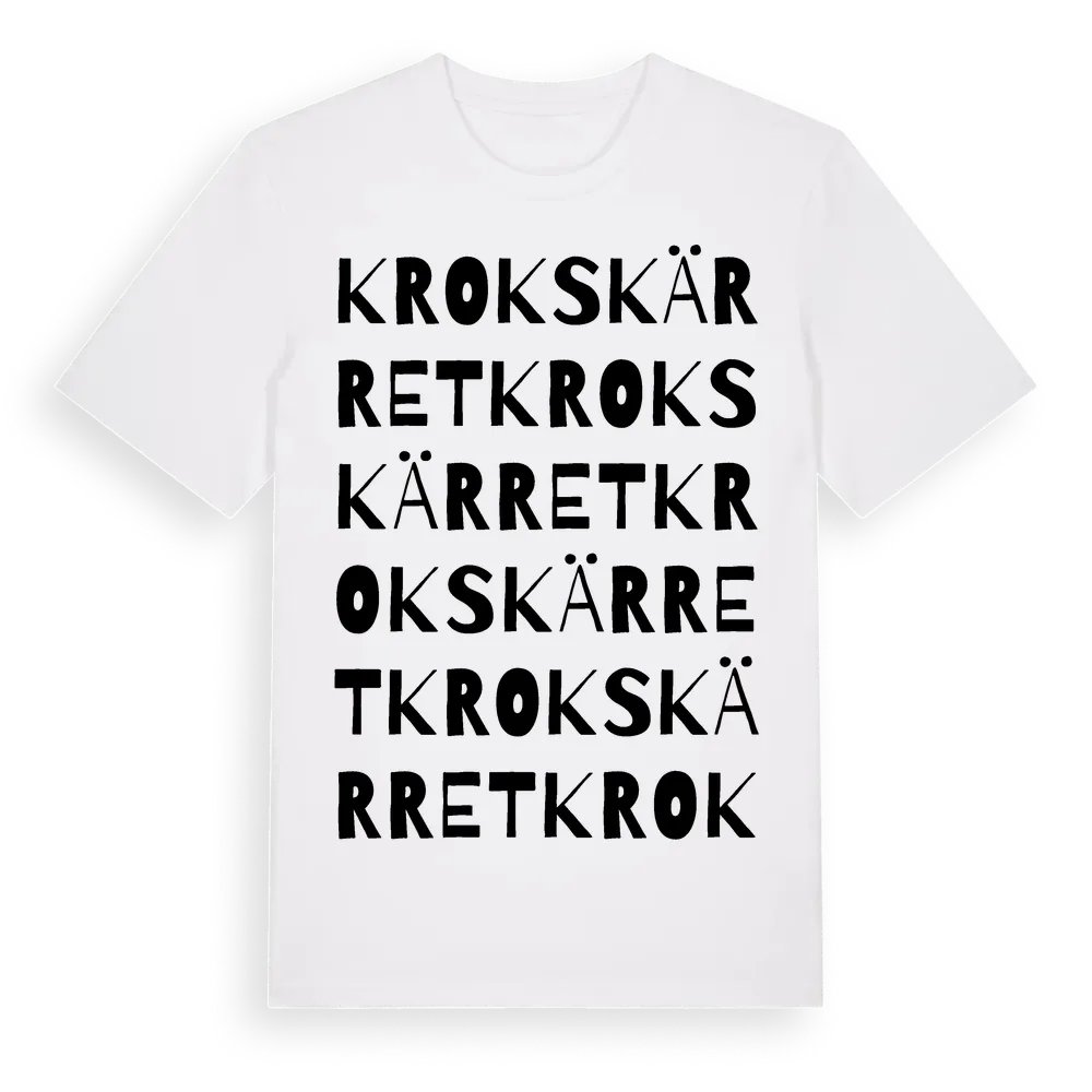 Krokskärret ordlek t-shirt är inspirerad av Krokskärret i Östergötlands län, Sverige. Tröjan är designad för dig som har en speciell koppling till platsen – oavsett om du bor här, har rötterna här eller bara älskar Krokskärret.