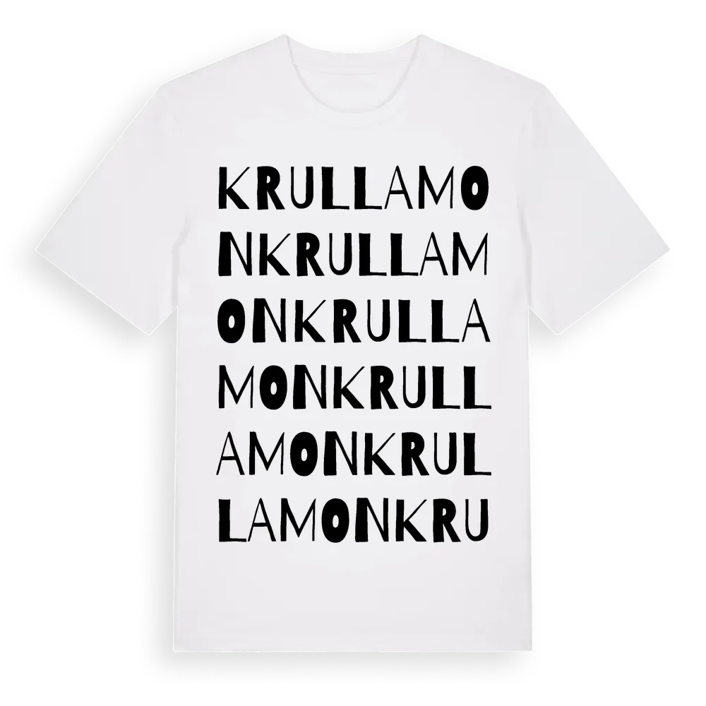 Krullamon ordlek t-shirt är inspirerad av Krullamon i Östergötlands län, Sverige. Tröjan är designad för dig som har en speciell koppling till platsen – oavsett om du bor här, har rötterna här eller bara älskar Krullamon.