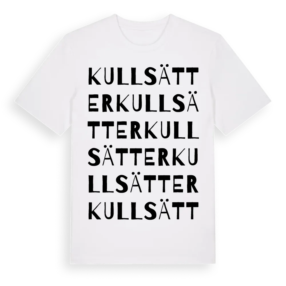 Kullsätter ordlek t-shirt är inspirerad av byn Kullsätter i Östergötlands län, Sverige. Tröjan är designad för dig som har en speciell koppling till platsen – oavsett om du bor här, har rötterna här eller bara älskar Kullsätter.