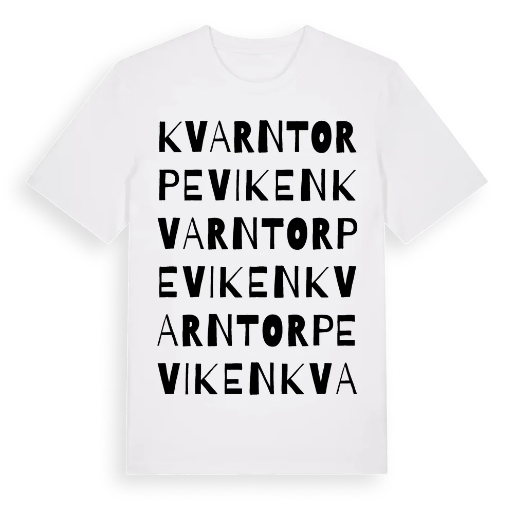 Kvarntorpeviken ordlek t-shirt är inspirerad av Kvarntorpeviken i Östergötlands län, Sverige. Tröjan är designad för dig som har en speciell koppling till platsen – oavsett om du bor här, har rötterna här eller bara älskar Kvarntorpeviken.