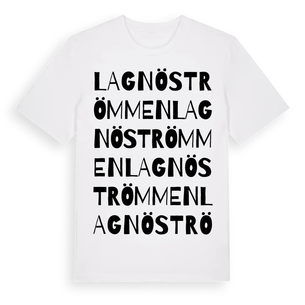 En ordlek byggd på Lagnöströmmens namn. Subtilt och klurig – ett motiv som bara de som verkligen känner platsen fullt ut förstår. Premium bomull, unisex – från Lagnöströmmen i Östergötlands län.