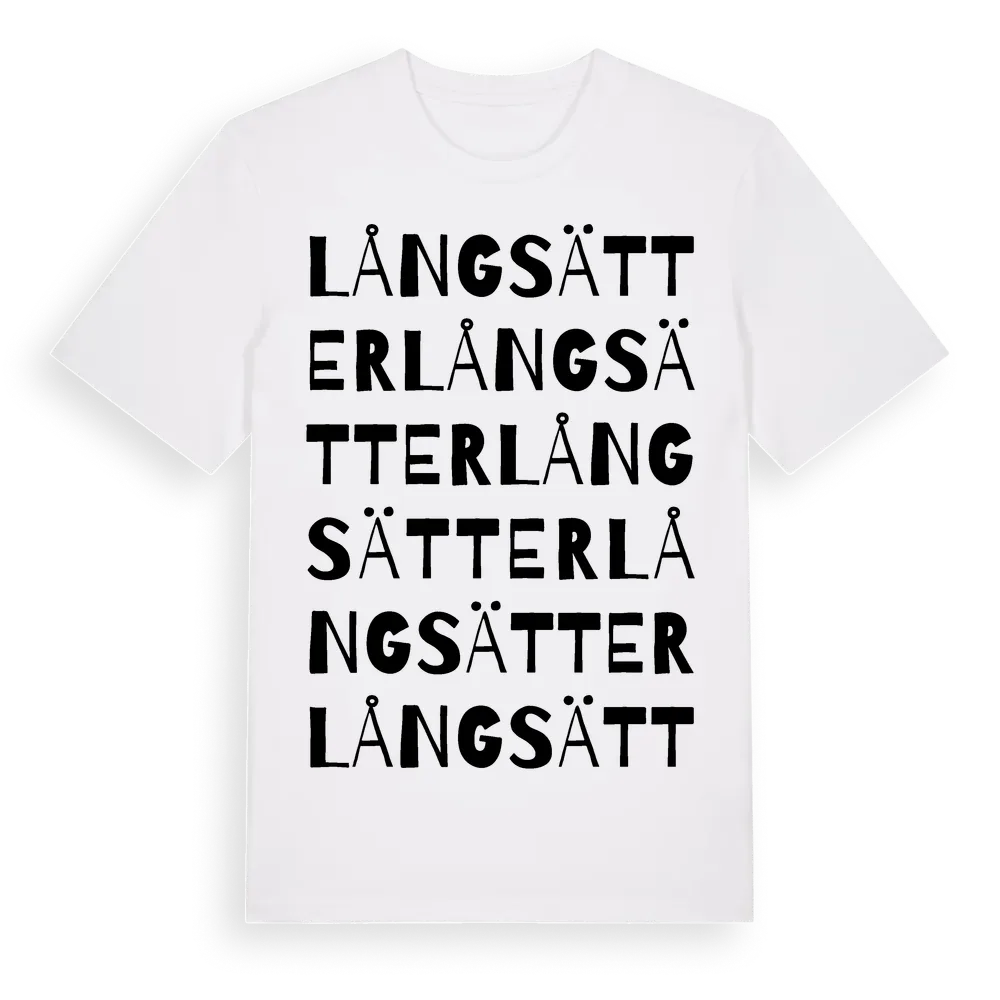 Långsätter ordlek t-shirt är inspirerad av Långsätter i Östergötlands län, Sverige. Tröjan är designad för dig som har en speciell koppling till platsen – oavsett om du bor här, har rötterna här eller bara älskar Långsätter.
