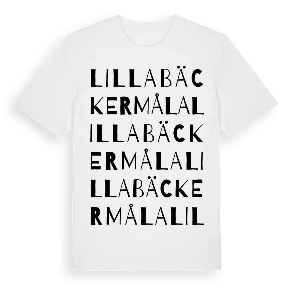 Lilla Bäckermåla ordlek t-shirt är inspirerad av Lilla Bäckermåla i Östergötlands län, Sverige. Tröjan är designad för dig som har en speciell koppling till platsen – oavsett om du bor här, har rötterna här eller bara älskar Lilla Bäckermåla.