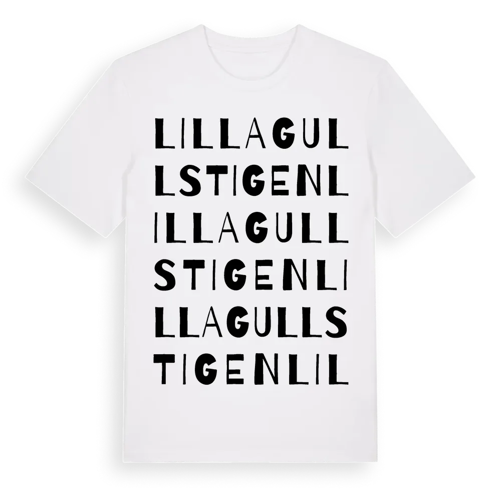 Lilla Gullstigen ordlek t-shirt är inspirerad av Lilla Gullstigen i Östergötlands län, Sverige. Tröjan är designad för dig som har en speciell koppling till platsen – oavsett om du bor här, har rötterna här eller bara älskar Lilla Gullstigen.