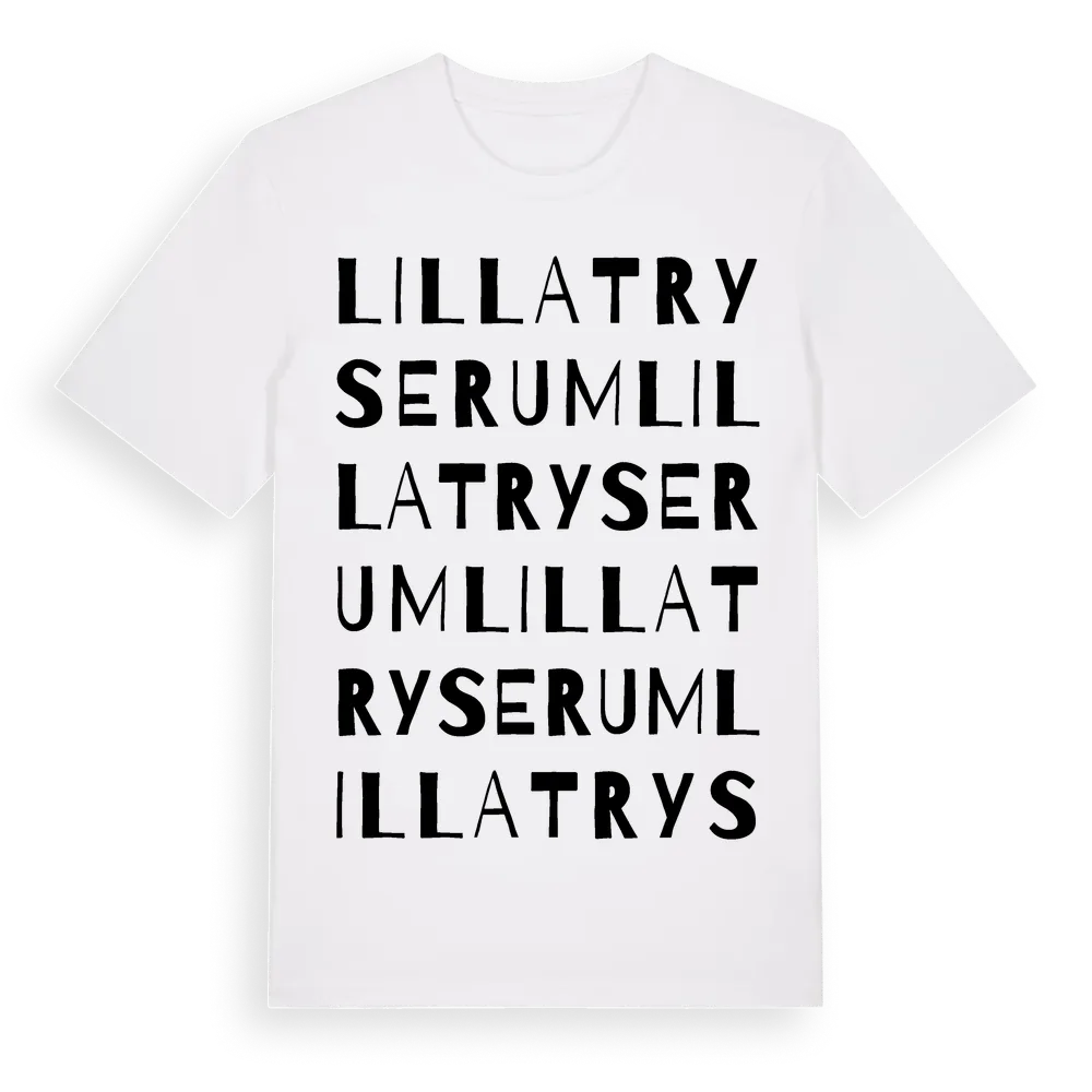 Lilla Tryserum ordlek t-shirt är inspirerad av byn Lilla Tryserum i Östergötlands län, Sverige. Tröjan är designad för dig som har en speciell koppling till platsen – oavsett om du bor här, har rötterna här eller bara älskar Lilla Tryserum.