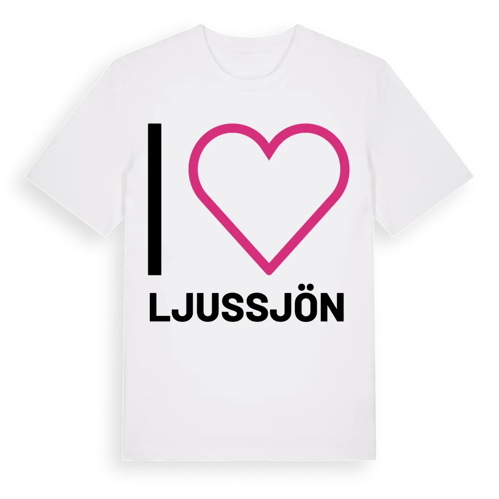 Det klassiska "I ❤ Ljussjön"-motivet i stort format som täcker hela bröstet. För dig som vill visa kärleken till Ljussjön på riktigt. Premium bomull, unisex – från Ljussjön i Östergötlands län.