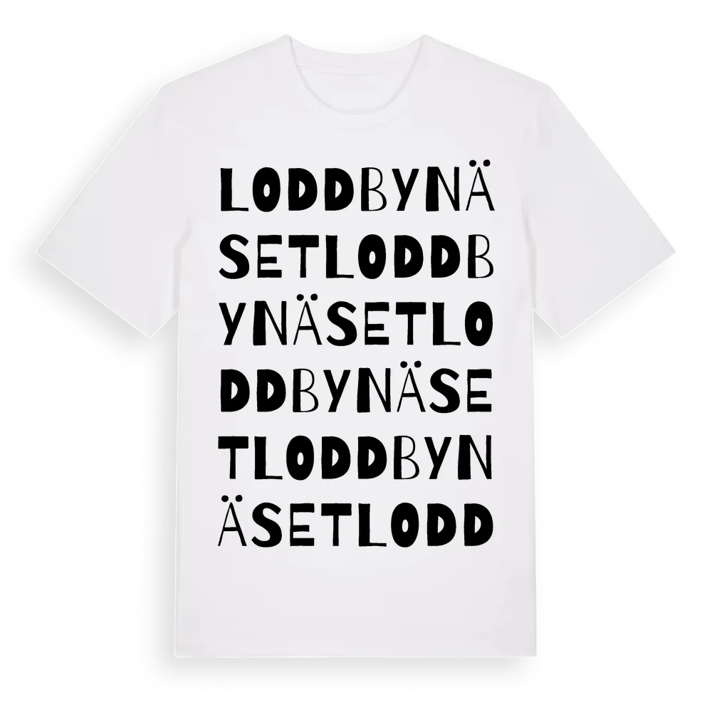 Loddbynäset ordlek t-shirt är inspirerad av Loddbynäset i Östergötlands län, Sverige. Tröjan är designad för dig som har en speciell koppling till platsen – oavsett om du bor här, har rötterna här eller bara älskar Loddbynäset.
