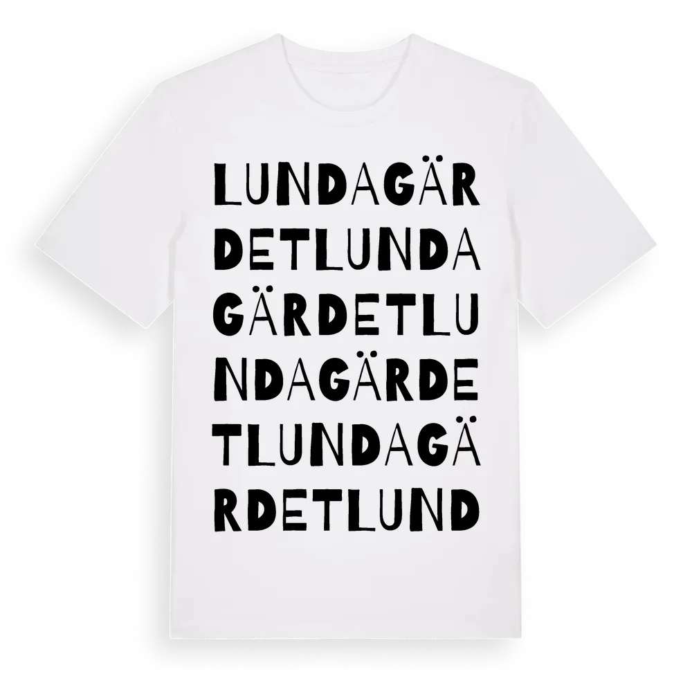 Lundagärdet ordlek t-shirt är inspirerad av Lundagärdet i Östergötlands län, Sverige. Tröjan är designad för dig som har en speciell koppling till platsen – oavsett om du bor här, har rötterna här eller bara älskar Lundagärdet.