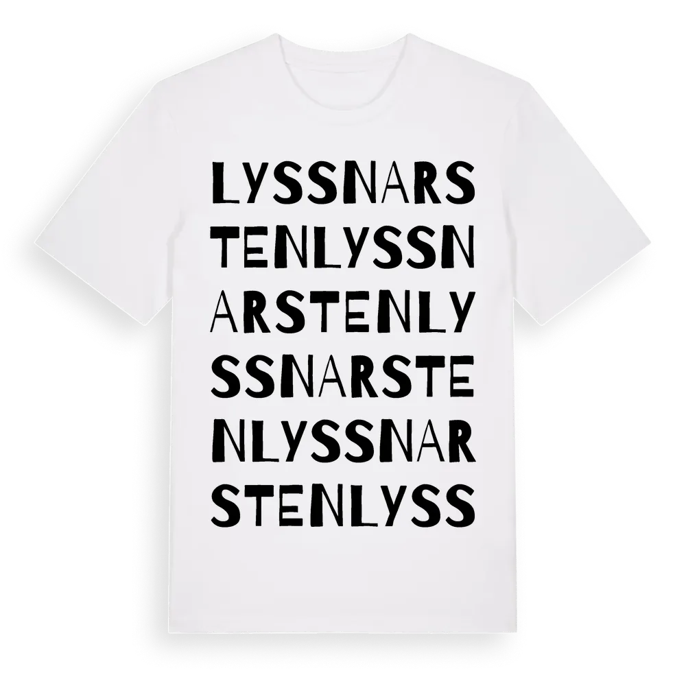 Lyssnarsten ordlek t-shirt är inspirerad av Lyssnarsten i Östergötlands län, Sverige. Tröjan är designad för dig som har en speciell koppling till platsen – oavsett om du bor här, har rötterna här eller bara älskar Lyssnarsten.
