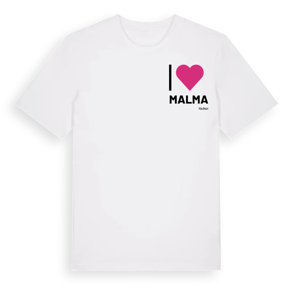 Jag älskar Malma t-shirt litet tryck är inspirerad av byn Malma i Östergötlands län, Sverige. Tröjan är designad för dig som har en speciell koppling till platsen – oavsett om du bor här, har rötterna här eller bara älskar Malma.