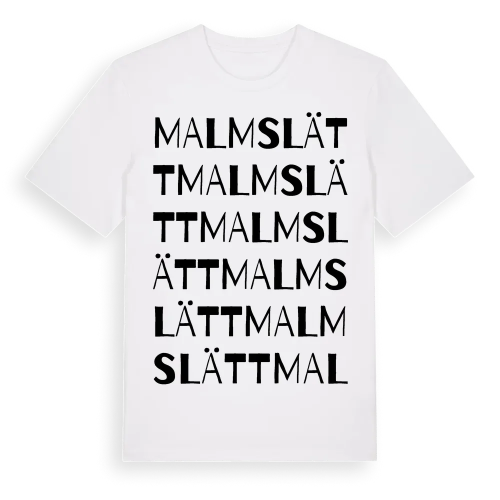 Malmslätt ordlek t-shirt är inspirerad av byn Malmslätt i Östergötlands län, Sverige. Tröjan är designad för dig som har en speciell koppling till platsen – oavsett om du bor här, har rötterna här eller bara älskar Malmslätt.