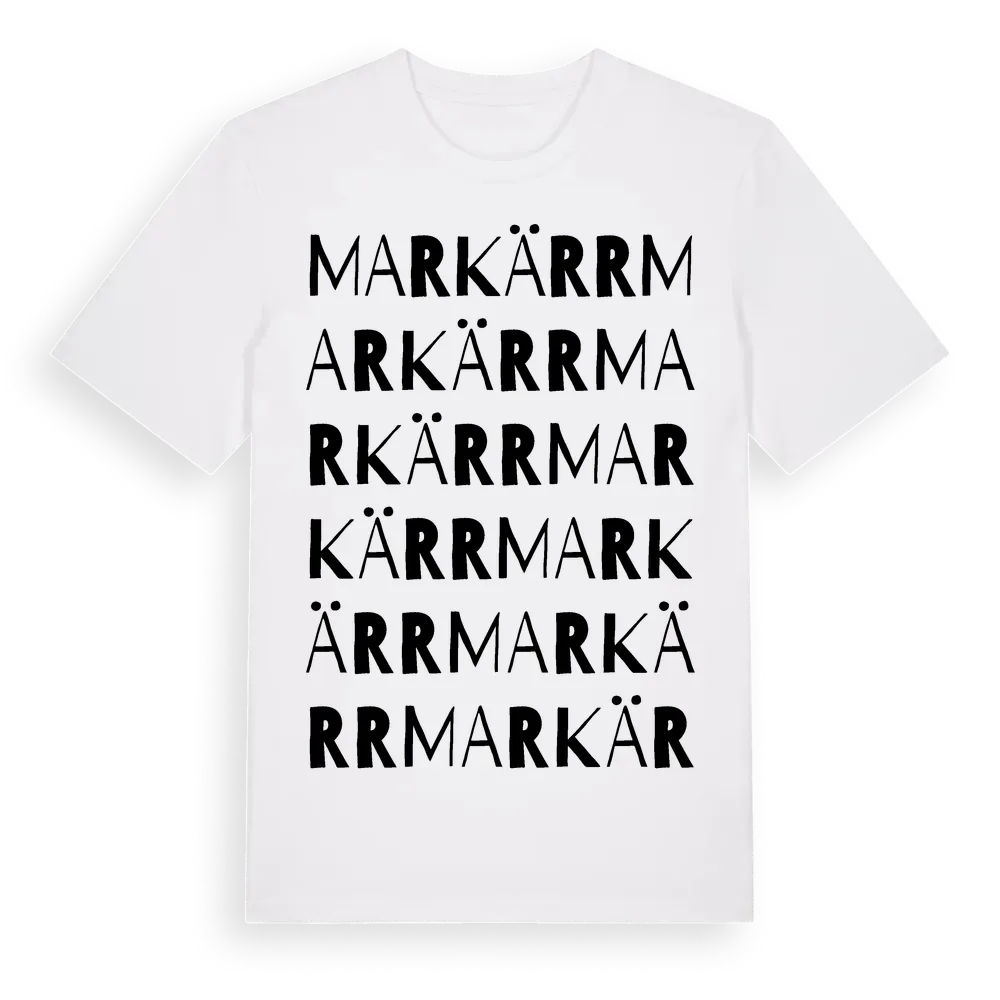 Markärr ordlek t-shirt är inspirerad av Markärr i Östergötlands län, Sverige. Tröjan är designad för dig som har en speciell koppling till platsen – oavsett om du bor här, har rötterna här eller bara älskar Markärr.