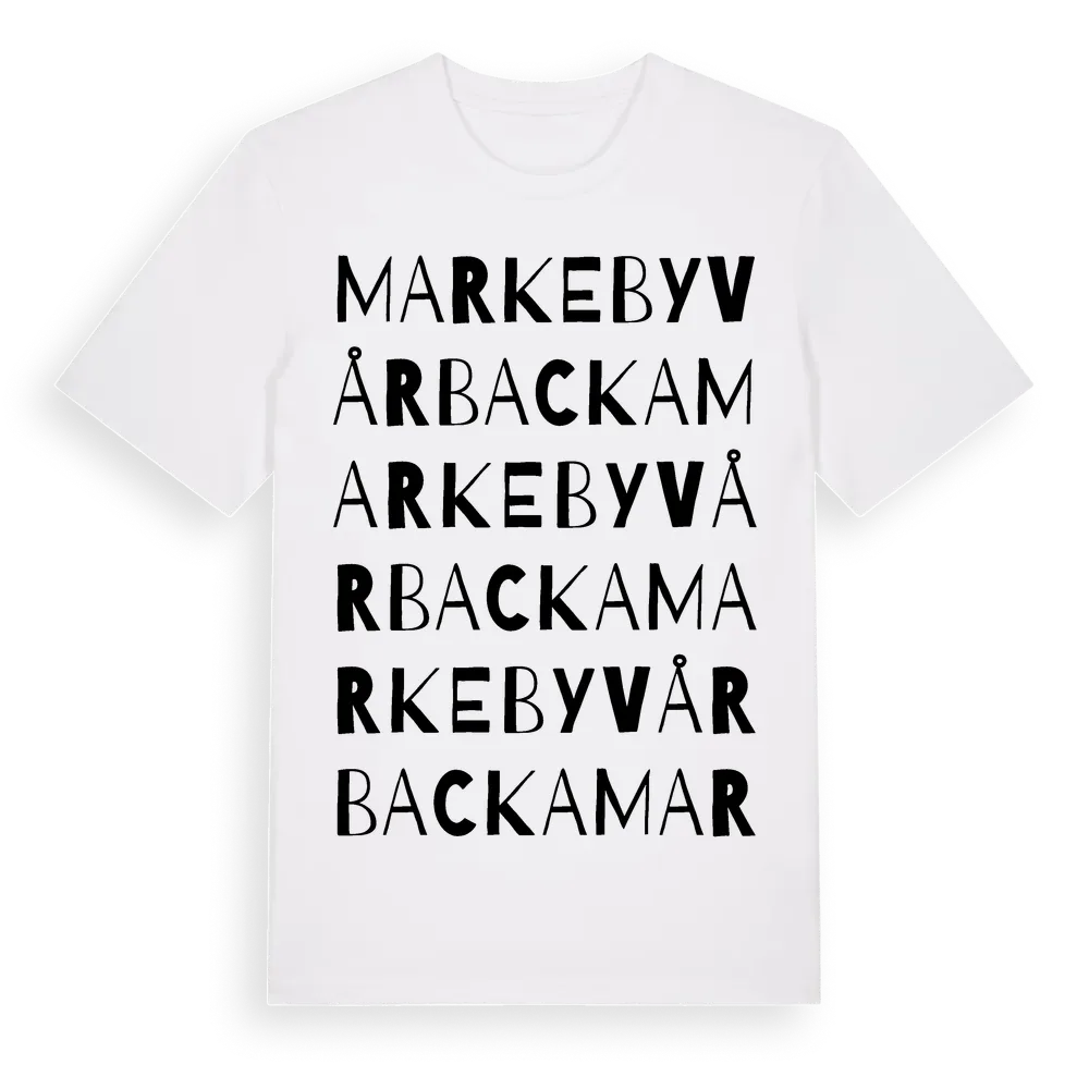 Markeby Vårbacka ordlek t-shirt är inspirerad av Markeby Vårbacka i Östergötlands län, Sverige. Tröjan är designad för dig som har en speciell koppling till platsen – oavsett om du bor här, har rötterna här eller bara älskar Markeby Vårbacka.