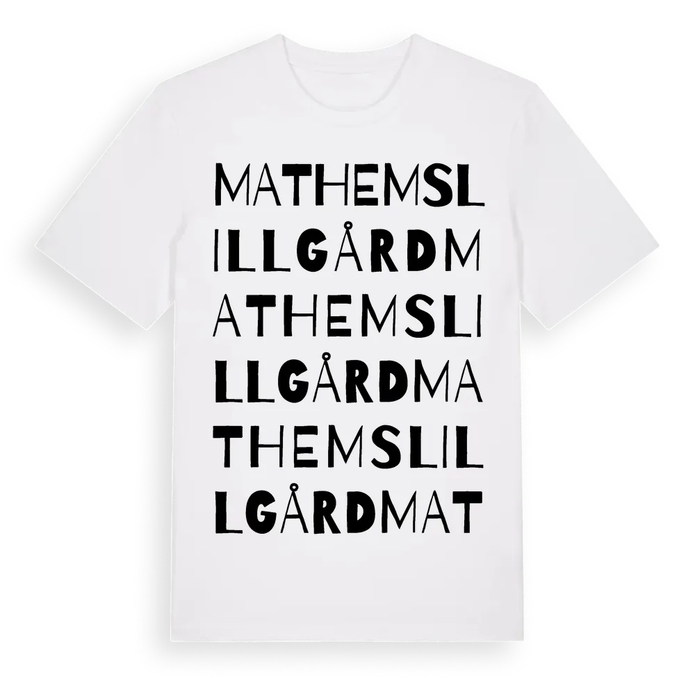 Mathems Lillgård ordlek t-shirt är inspirerad av Mathems Lillgård i Östergötlands län, Sverige. Tröjan är designad för dig som har en speciell koppling till platsen – oavsett om du bor här, har rötterna här eller bara älskar Mathems Lillgård.