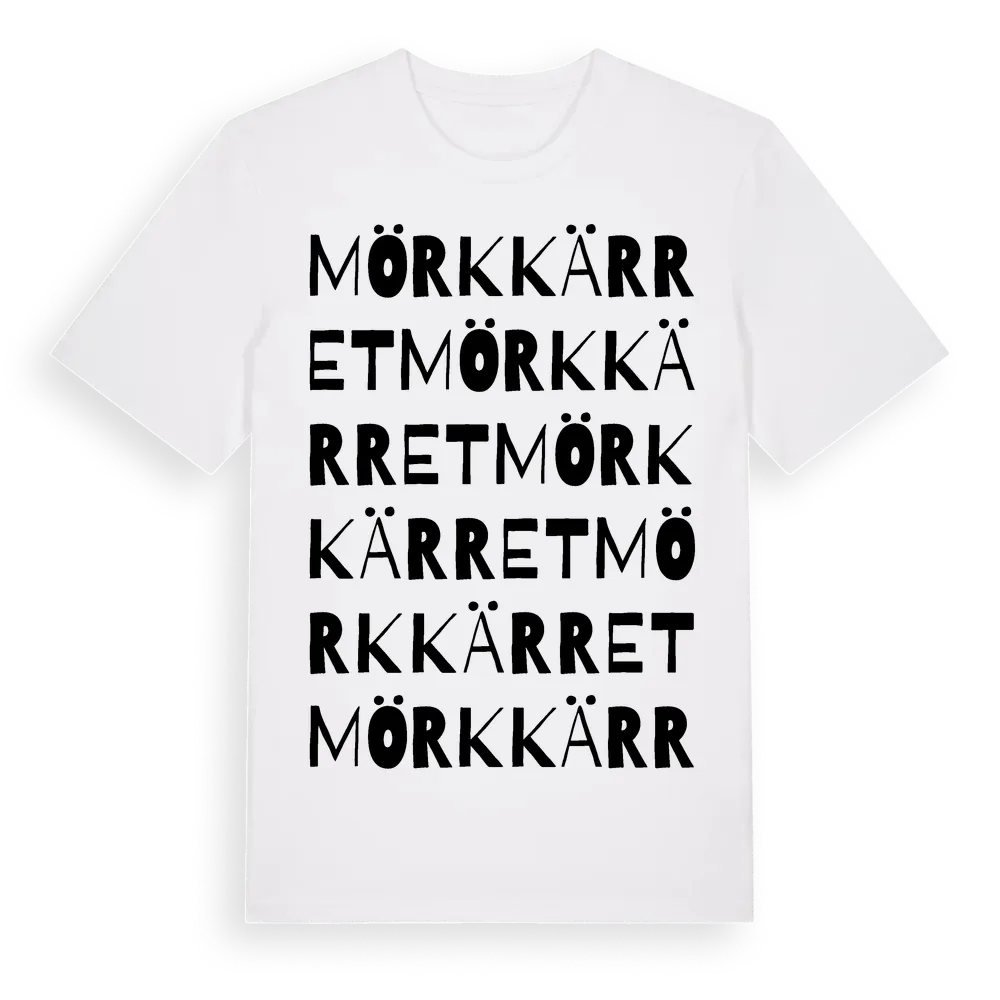 Mörkkärret ordlek t-shirt är inspirerad av Mörkkärret i Östergötlands län, Sverige. Tröjan är designad för dig som har en speciell koppling till platsen – oavsett om du bor här, har rötterna här eller bara älskar Mörkkärret.