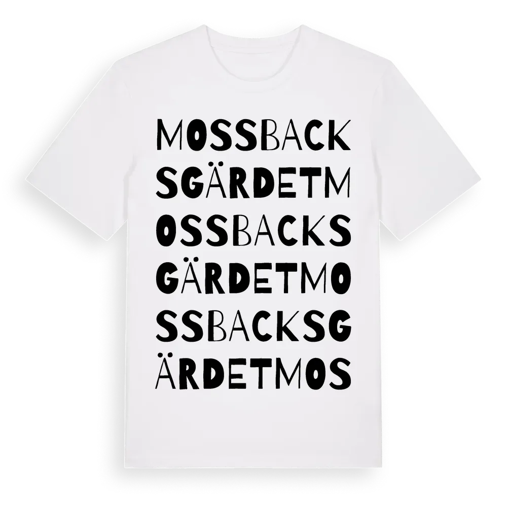 Mossbacksgärdet ordlek t-shirt är inspirerad av Mossbacksgärdet i Östergötlands län, Sverige. Tröjan är designad för dig som har en speciell koppling till platsen – oavsett om du bor här, har rötterna här eller bara älskar Mossbacksgärdet.