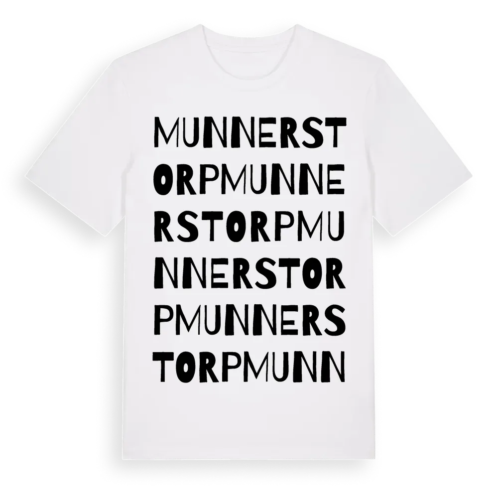 Munnerstorp ordlek t-shirt är inspirerad av Munnerstorp i Östergötlands län, Sverige. Tröjan är designad för dig som har en speciell koppling till platsen – oavsett om du bor här, har rötterna här eller bara älskar Munnerstorp.