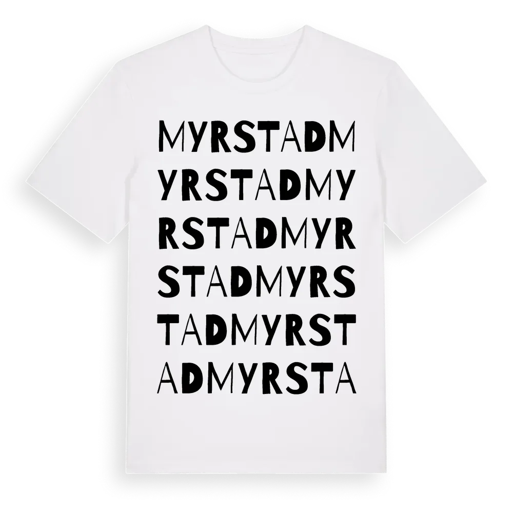 Myrstad ordlek t-shirt är inspirerad av Myrstad i Östergötlands län, Sverige. Tröjan är designad för dig som har en speciell koppling till platsen – oavsett om du bor här, har rötterna här eller bara älskar Myrstad.