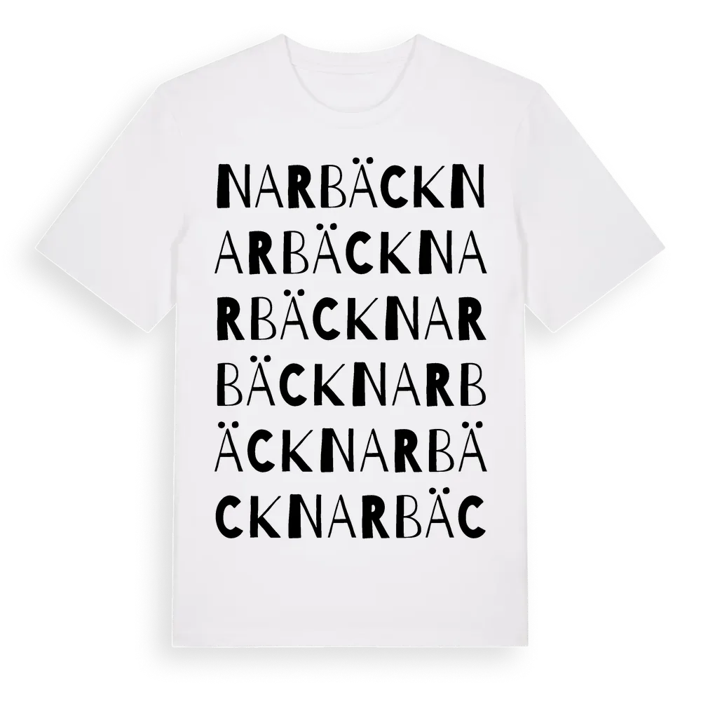 Narbäck ordlek t-shirt är inspirerad av Narbäck i Östergötlands län, Sverige. Tröjan är designad för dig som har en speciell koppling till platsen – oavsett om du bor här, har rötterna här eller bara älskar Narbäck.