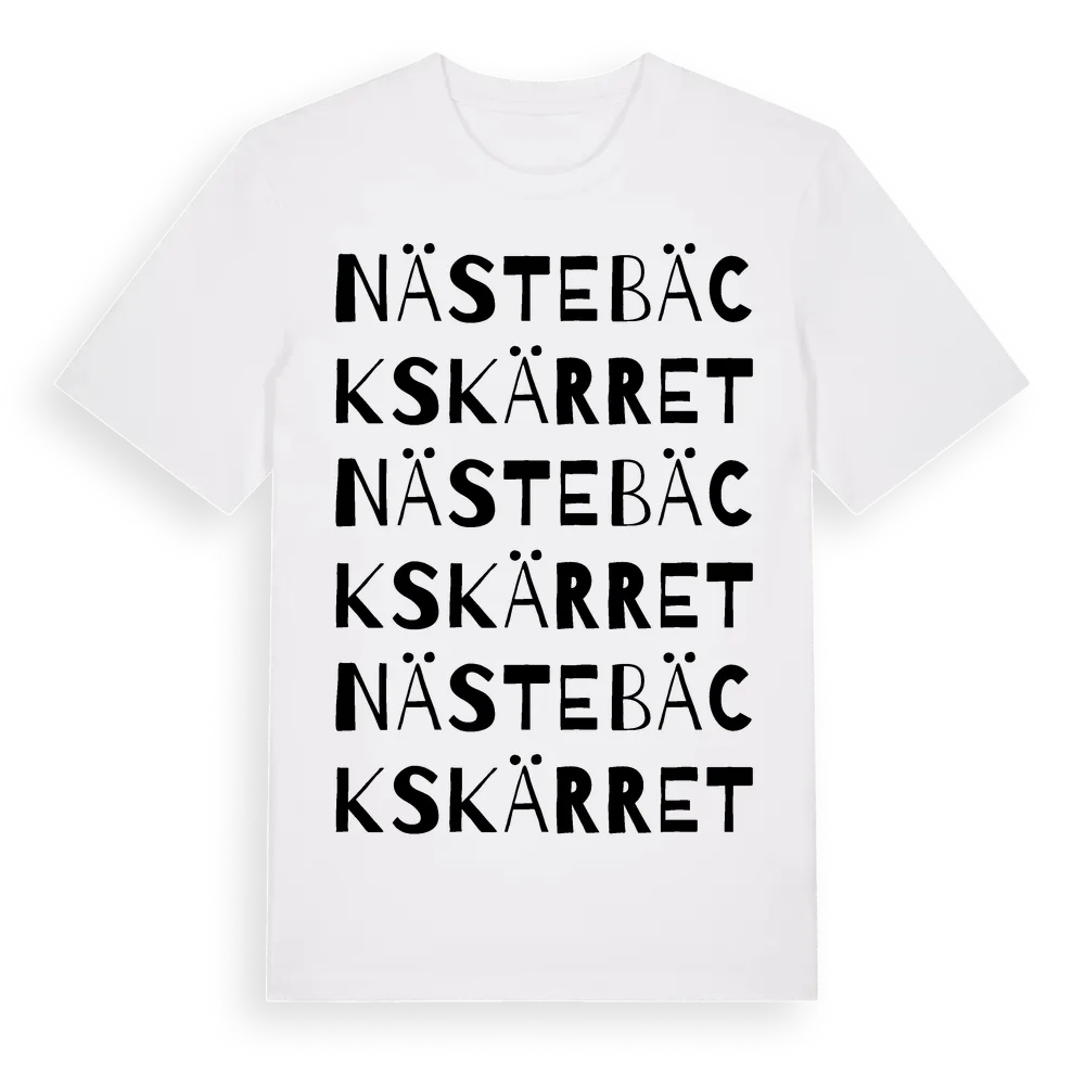 Nästebäckskärret ordlek t-shirt är inspirerad av Nästebäckskärret i Östergötlands län, Sverige. Tröjan är designad för dig som har en speciell koppling till platsen – oavsett om du bor här, har rötterna här eller bara älskar Nästebäckskärret.