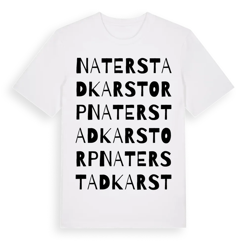Naterstad Karstorp ordlek t-shirt är inspirerad av Naterstad Karstorp i Östergötlands län, Sverige. Tröjan är designad för dig som har en speciell koppling till platsen – oavsett om du bor här, har rötterna här eller bara älskar Naterstad Karstorp.
