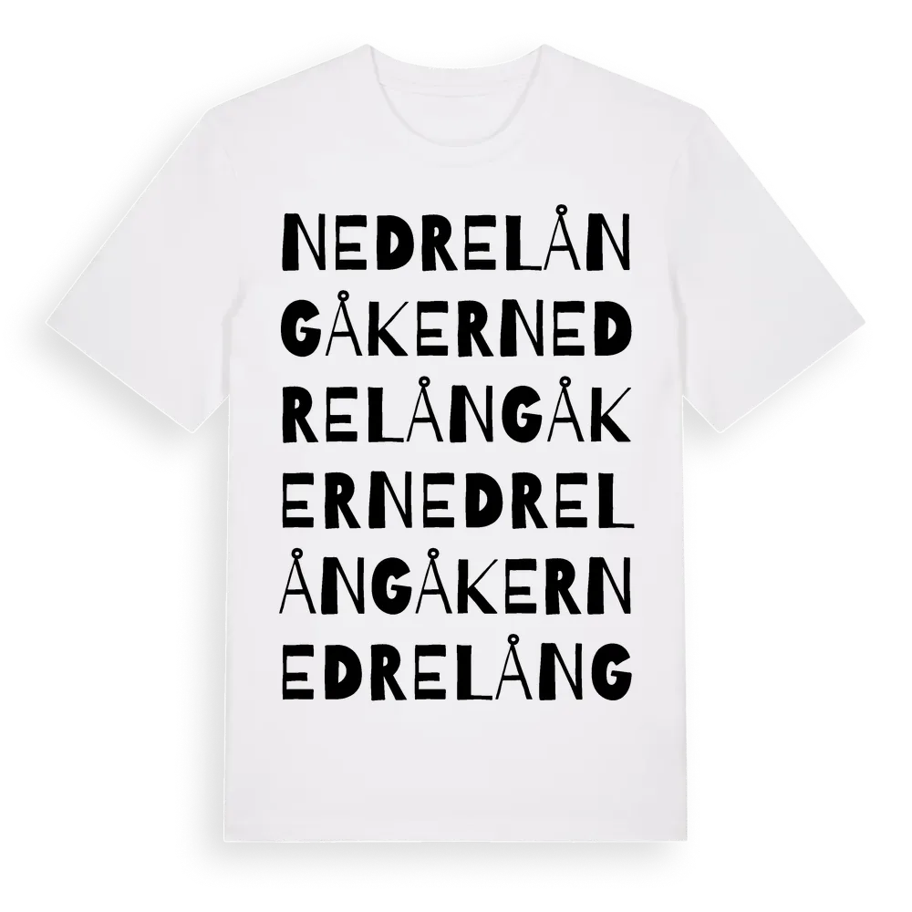 Nedre Långåker ordlek t-shirt är inspirerad av Nedre Långåker i Östergötlands län, Sverige. Tröjan är designad för dig som har en speciell koppling till platsen – oavsett om du bor här, har rötterna här eller bara älskar Nedre Långåker.